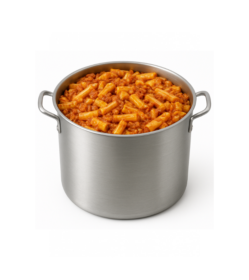 A hearty, protein-enhanced pasta meal prepared in bulk for large-scale feeding and humanitarian support.